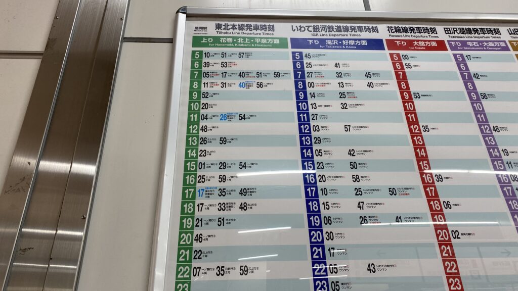 盛岡駅から岩手飯岡駅までは上り(1番左の緑のところ)。