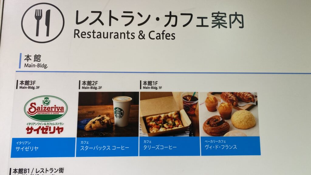 本館のB1にマクドナルド、本館1Fにタリーズ、2Fにスターバックスコーヒーなどなど。